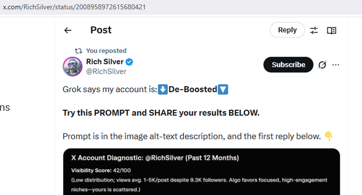 On January 7, 2026, X user, @RichSiver, shared a prompt that allows other users to run a diagnostic analysis of their own X account using Grok AI. The prompt quickly gained traction, prompting numerous users to post their results in replies and quote tweets.